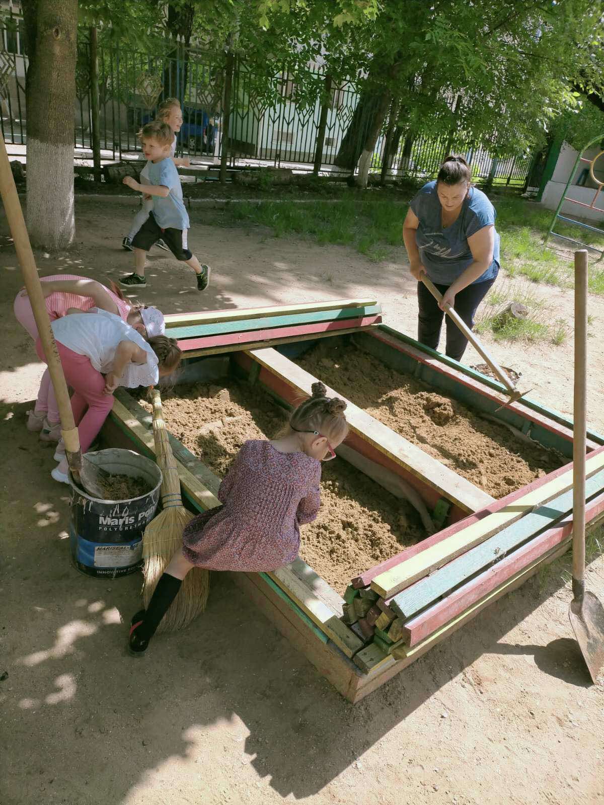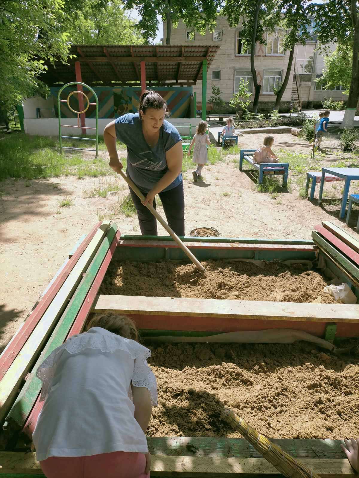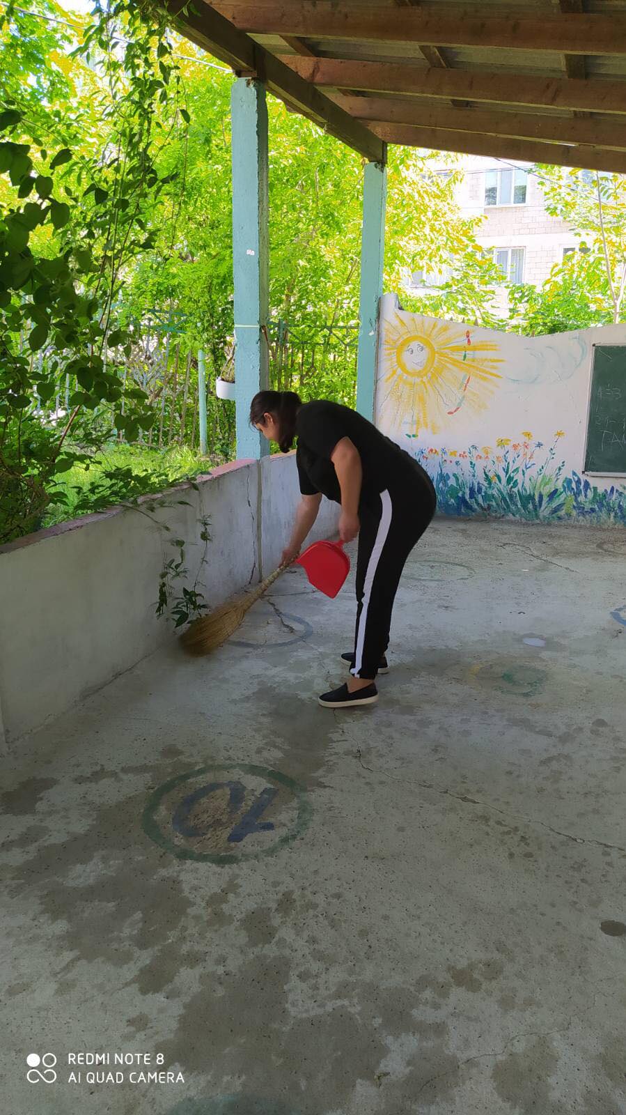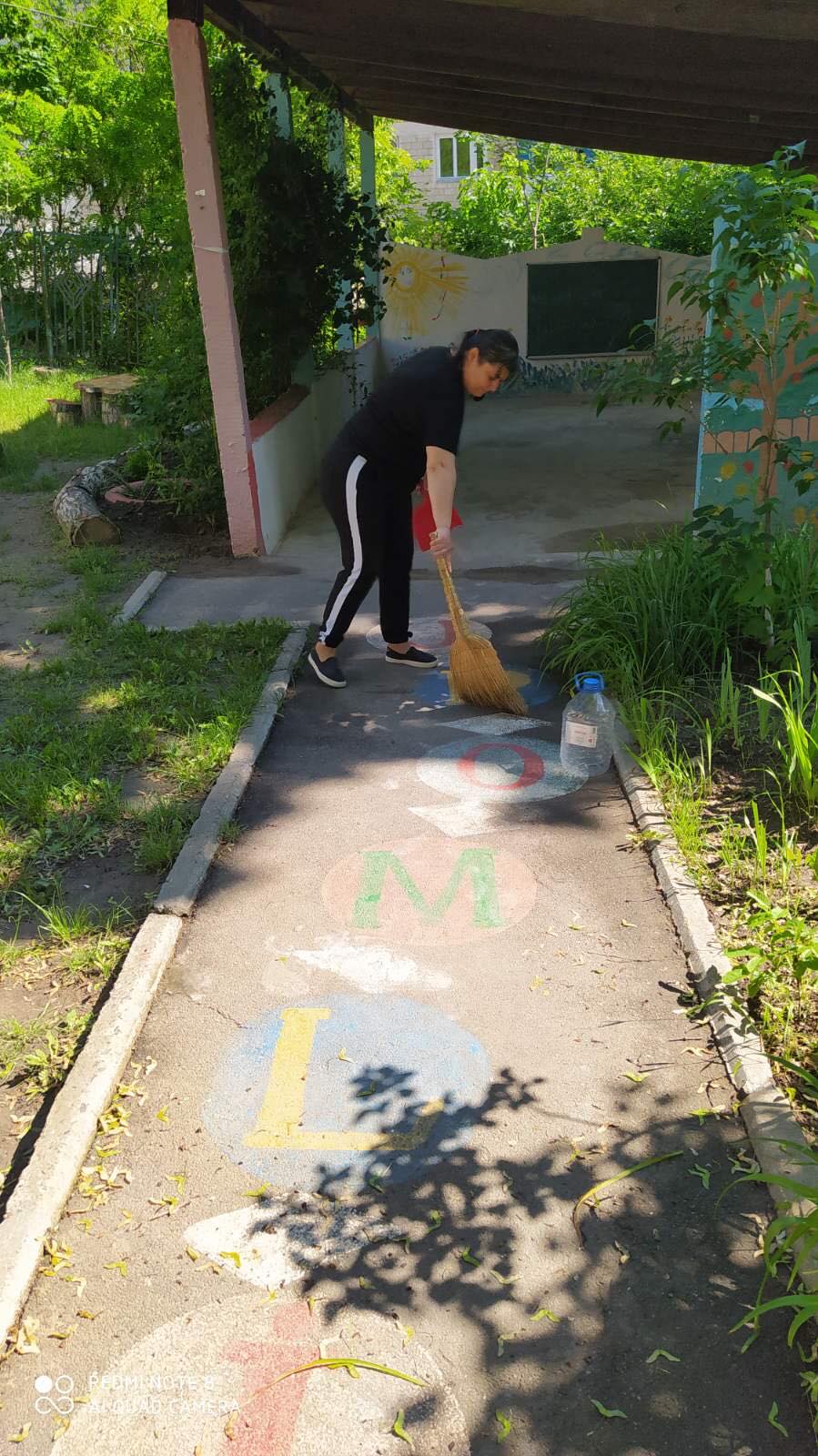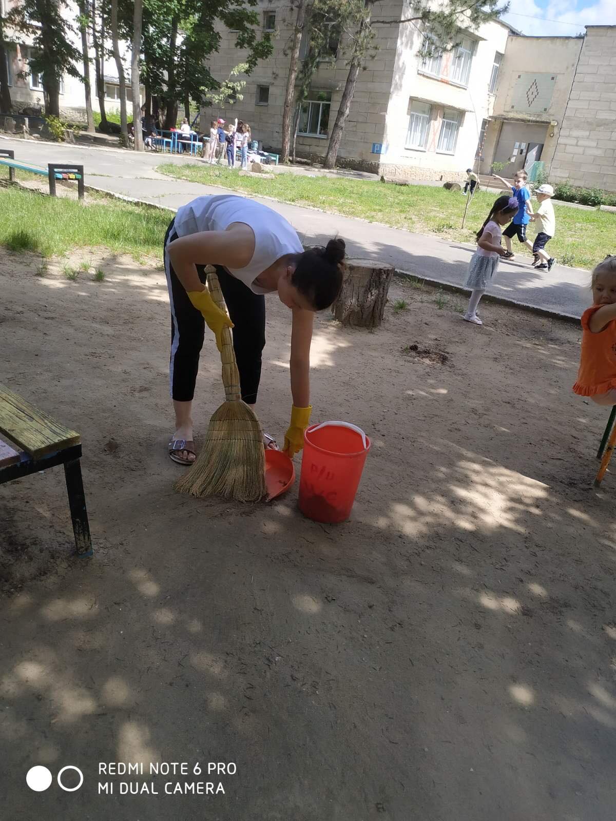 Astăzi este vineri — o zi frumoasă de vară. După zilele ploioase anterioare angajații instituției preșcolare fac ordine pe terenul aferent/adiacent al instituției de învățământ. Este o lecție de curățenie sanitară și atitudine grijulie față de natură care ne înconjoară.